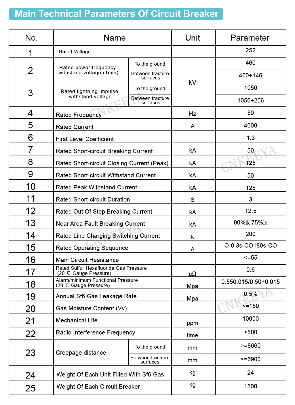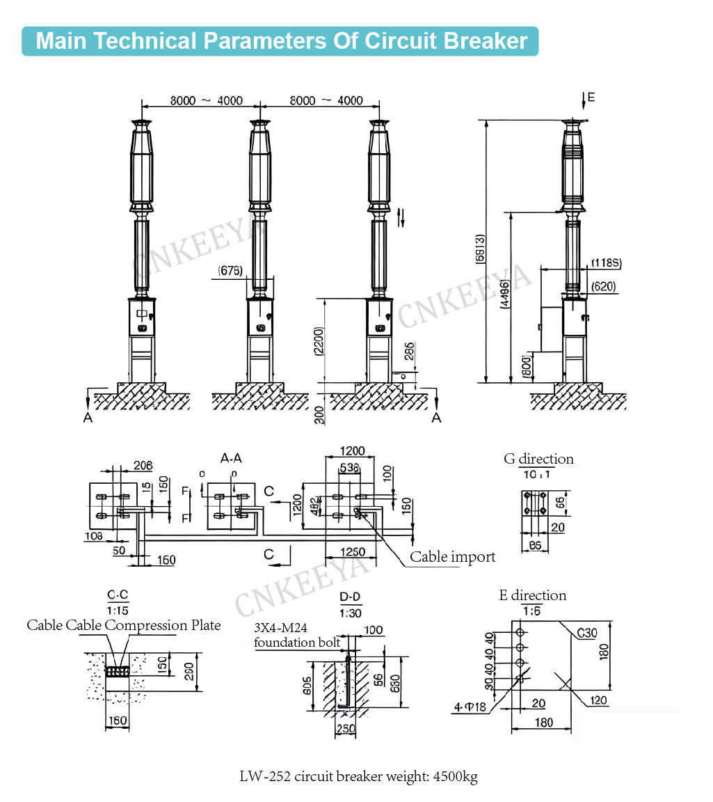 A CNKEEYA,LW□-252 kültéri nagyfeszültségű váltakozó áramú kén-hexafluorid (SF₆) áramköri megszakító egy kültéri termék, amely 50 Hz-es váltakozó áramú hálózatokhoz használható 252 kV maximális feszültséggel olyan területeken, ahol a tengerszint feletti magasság ≤ 2000 m, környezeti hőmérséklet ≤ 30 ≤ ≤. Főleg névleges és hibaáramok megszakítására, áramköri vonalak kapcsolására, valamint összeköttetés-megszakítóként szolgál, az energiarendszerek hatékony szabályozását és védelmét megvalósítva.