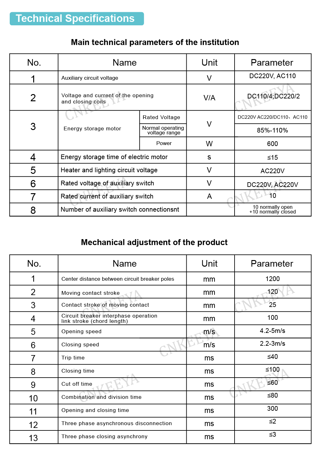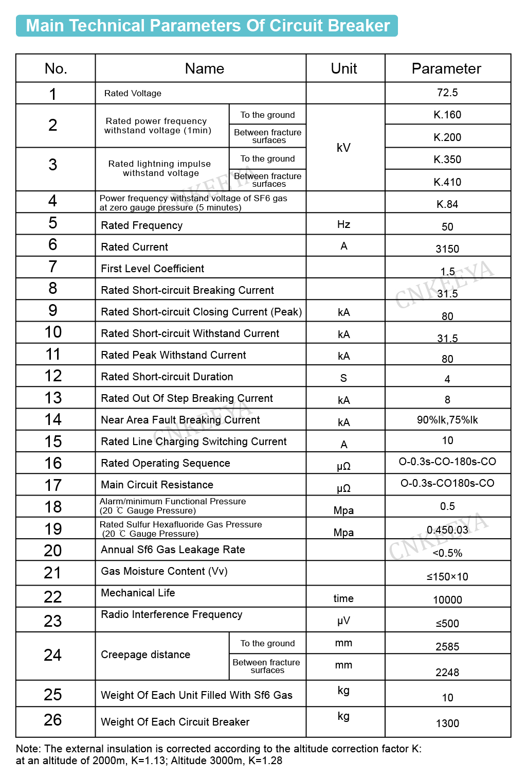 Névleges elektromos paraméterek (feszültség, áram, törési áram stb.); A vezérlőáramkör névleges elektromos paraméterei (az energiatároló motor névleges feszültsége, a nyitó és záró tekercsek névleges feszültsége) olyan környezeti feltételek alapján, mint a hőmérséklet, magasság és szennyezettségi szint;